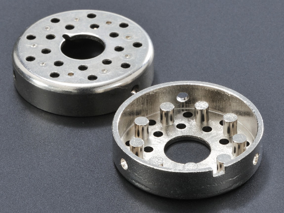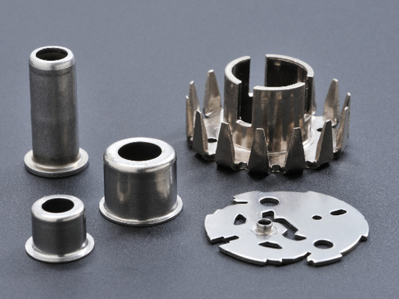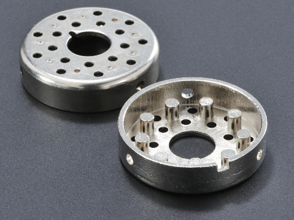 | 使用箇所 | ①複写機ギアレーションの中心部品 ②0.85、1.0、1.8インチのHDDの基台(絞り多数箇所、抜き多数箇所、ケーシング、タップ等) ③絞り後の高さ精度が重要な自動車エンジン用スペーサー部品 ④毛玉取り器の回転カッターの外刃部品(絞り+刃付け) ⑤モバイルの基板上の複数配線部をまたぐ磁気シールド部品 他多数利用 |